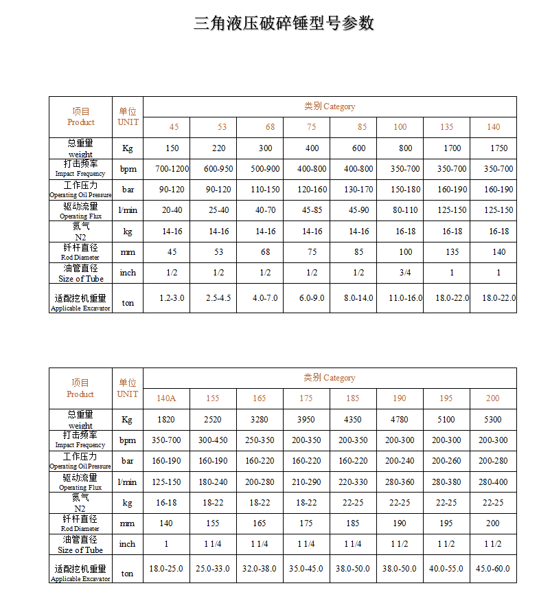 挖掘機(jī)的(de)型号、噸位不(bù)一(yī)£&→®就(jiù)需要(yào)選擇不(bù)同型号的(de)破碎錘,确保∞±挖掘機(jī)液壓泵的(de)工(gōng)作(zuò)壓力、流量在破碎錘€¥ 的(de)參數(shù)之內(nèi)。γ↑₩在這(zhè)裡(lǐ)可(kě)以根據下(xià)表所☆'示三角錘的(de)各項參數(shù)選擇合适型号的(de)力固₽ε破碎錘,這(zhè)個(gè)表也(yě)僅作(z★≥uò)為(wèi)參考作(zuò)用(yòng)。 δ¥